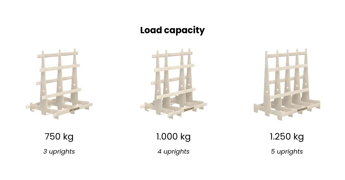 Every vertical upright adds 250 kg of load capacity. Build the strength you need without overinvesting.